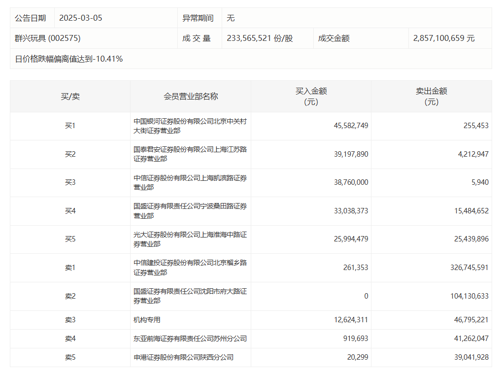 群兴玩具跌停,上榜席位净卖出4.07亿元群兴玩具跌停,上榜席位净卖出4.07亿元