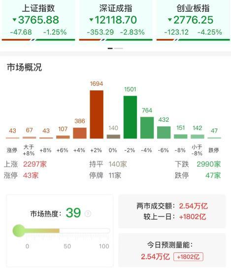 今日市场全天震荡走低,创业板指领跌,科创50指数跌超6%。截至收盘,沪指跌1.25%,深成指跌2.83%,创业板指跌4.25%。个股跌多涨少,全市场近3000只个股下跌。沪深两市全天成交额2.54万亿,较上个交易日放量1802亿。